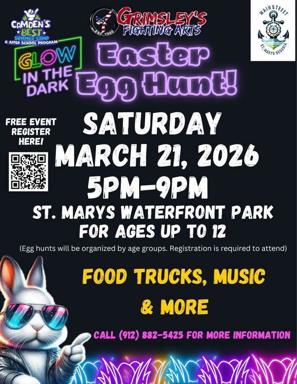 Grimsley’s Fighting Arts and Camden’s Best Summer Camp & After School Program, in partnership with the St. Marys Main Street Downtown Development Authority, are excited to host our Annual Glow-in-the-Dark Easter Egg Extravaganza!